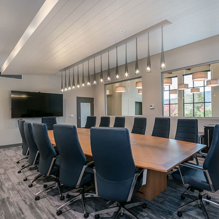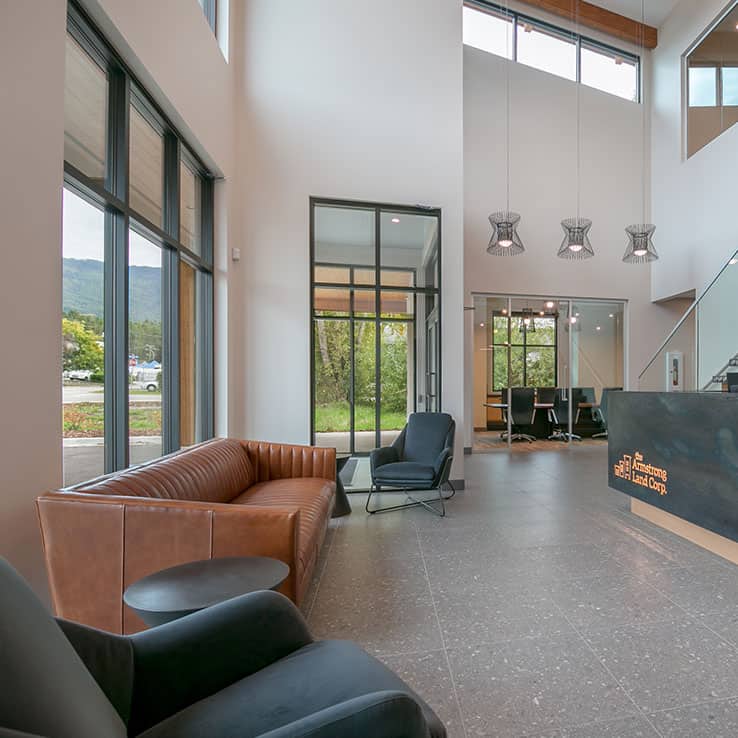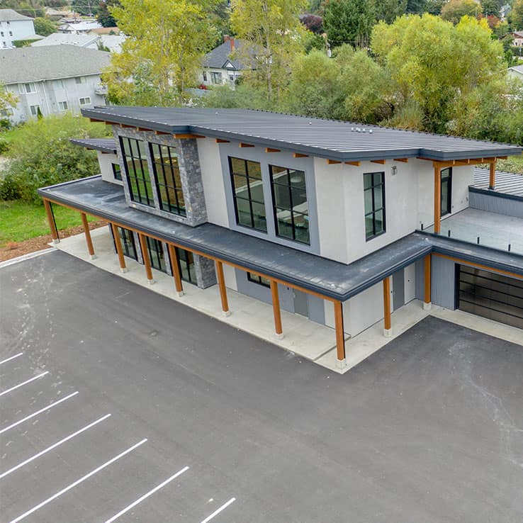 Our team provided complete structural engineering services for this modern two-storey commercial office building. Scope of work included the design of the primary structural systems—foundations, concrete slabs, structural steel and engineered wood framing—to support the striking cantilevered rooflines, expansive glazed walls, and large open meeting spaces.