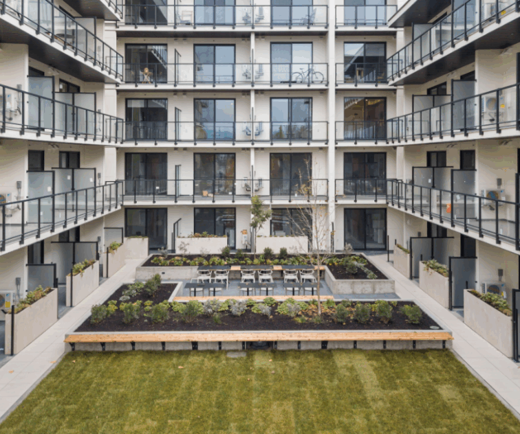 ROV provided the structural engineering for a striking mid-rise development in Kelowna’s Capri Landmark neighborhood, featuring a robust two-storey concrete parkade podium supporting five storeys of light-frame timber construction above. This innovative design combines the strength of concrete with the efficiency of wood framing, delivering both durability and sustainability for this mixed-use residential project.